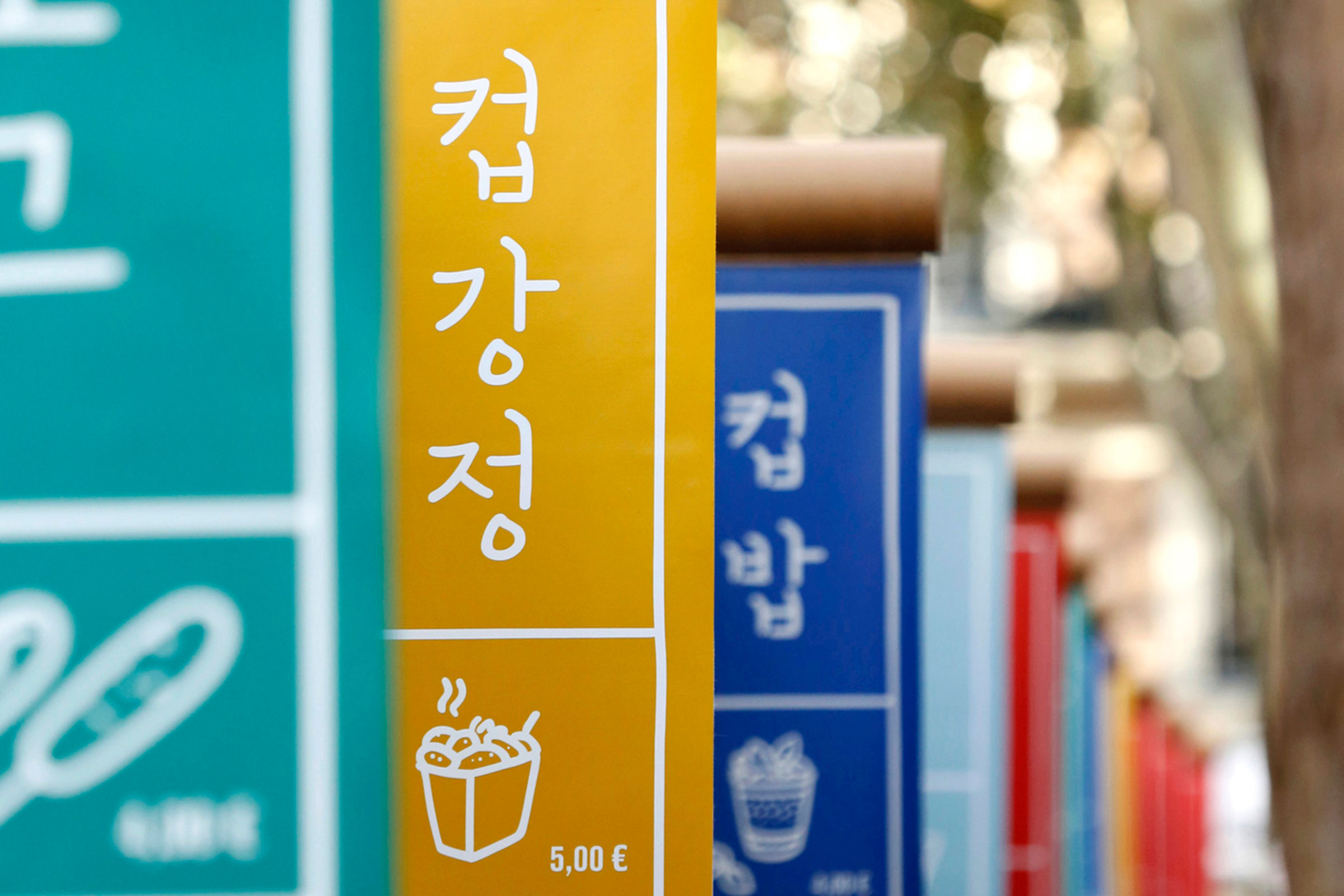 Signalétique et éléments de décors de l’événement Street Food Temple #2 au Carreau du Temple, festival de cuisine de rue organisé dans le cadre de l’année France-Corée. Suspensions et habillage graphique des bars, comptoirs, stands et du marché coréen extérieur.